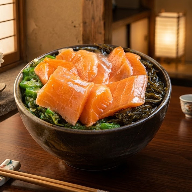 原材料名 アトランティックサーモン(チリ、ノルウェー)、めかぶ、おくら、モロヘイヤ、醤油、砂糖、山芋、がごめ昆布(北海道産)、発酵調味料(糖類、酒精、米、食塩、米麹)、アミノ酸液、清酒、風味調味料、昆布エキス、鰹節エキス、魚醤、果糖ブドウ糖液糖、食塩/調味料(アミノ酸等)、ソルビット、pH調整剤、増粘多糖類、香料、保存料(ソルビン酸K)、(一部に小麦・さけ・大豆・山芋を含む)